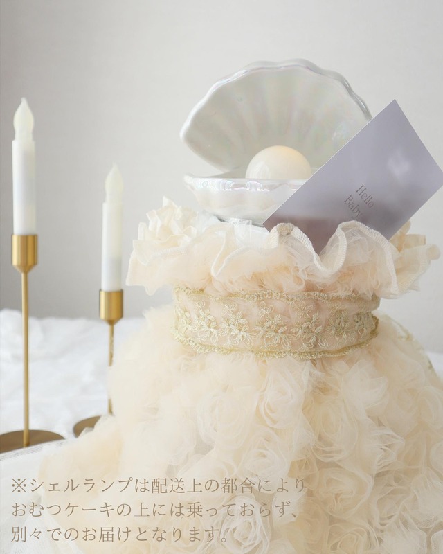 ※シェルランプは配送上の都合によりおむつケーキの上には乗っておらず、別々でのお届けとなります。 シェルランプ付きドレスダイパーケーキは、 出産のお守りとして、また育児での不安を抱える方にも優しさをもたしてくれると伝承されている天然石【マザーオブパール】(真珠を生み出す貝殻のことです)をモチーフにしたベビーシャワー用ダイパーケーキです❤︎ シェルランプは授乳ライトやインテリア小物、 撮影アイテムとしてお使い頂けます。 ドレスは赤ちゃんの100日祝いやハーフバースデー頃にお召し頂けます。 華やかで柔らかな色合いが優しい気持ちで 包まれていくような女の子らしいデザインです。 ⚫︎使用おむつ ナチュラルムーニー▶Sサイズ(4〜8kg)20枚 赤ちゃんがふれる内側の表面シートに、日本で唯一農薬を使わず栽培したオーガニックコットンを配合。 (ユニ・チャーム製造) 1枚づつoppクリスタルパックにて個包装しております。 ⚫︎Mサイズを選択された場合は18枚となります。 ⚫︎ダイパーケーキ(おむつケーキ)は、贈り物・ご自宅用に関わらず全商品無料ラッピングをしてお届けしております。 ⚫︎当店ではダイパーケーキ(おむつケーキ)は、「ギフト扱い」とさせて頂き、請求書や納品書などの金額の分かる物は同梱されません。必要な方は備考欄に必要なものをご記載下さい ⚫︎商品サイズ 直径 ▶ 約21cm 高さ ▶ 約40cm(シェルランプ込み) ・ドレスサイズ 73cm(6ヶ月〜12ヶ月) ・シェルランプ サイズ:17×15×15cm :5×5cm 素材:セラミック ライトの部分は取り外しが可能で、貝殻単体でも小物入れとして使うことができます。 ※LR44ボタン電池2個使用