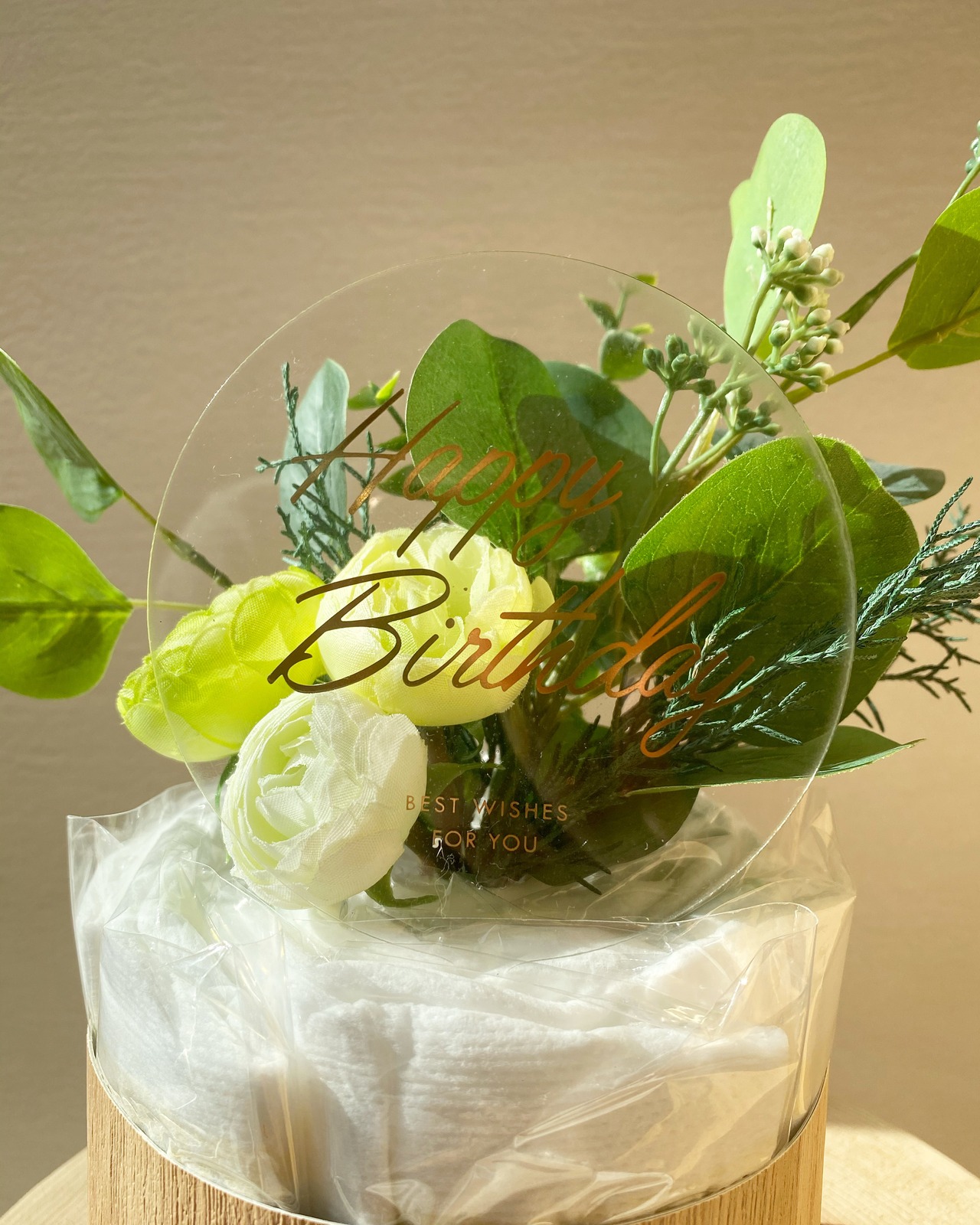 縁なしクリアのアクリルケーキトッパーです。シンプルで花材を引き立ててくれるのでどのダイパーケーキにもマッチします。