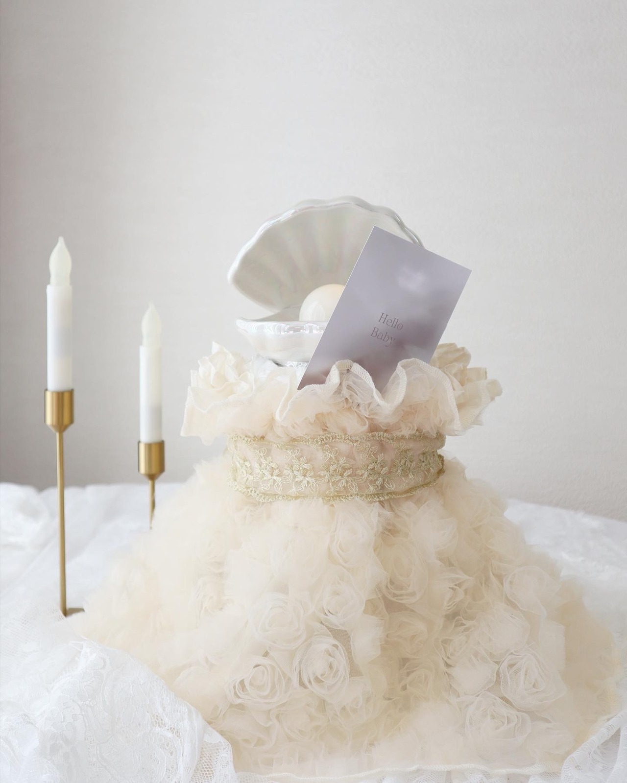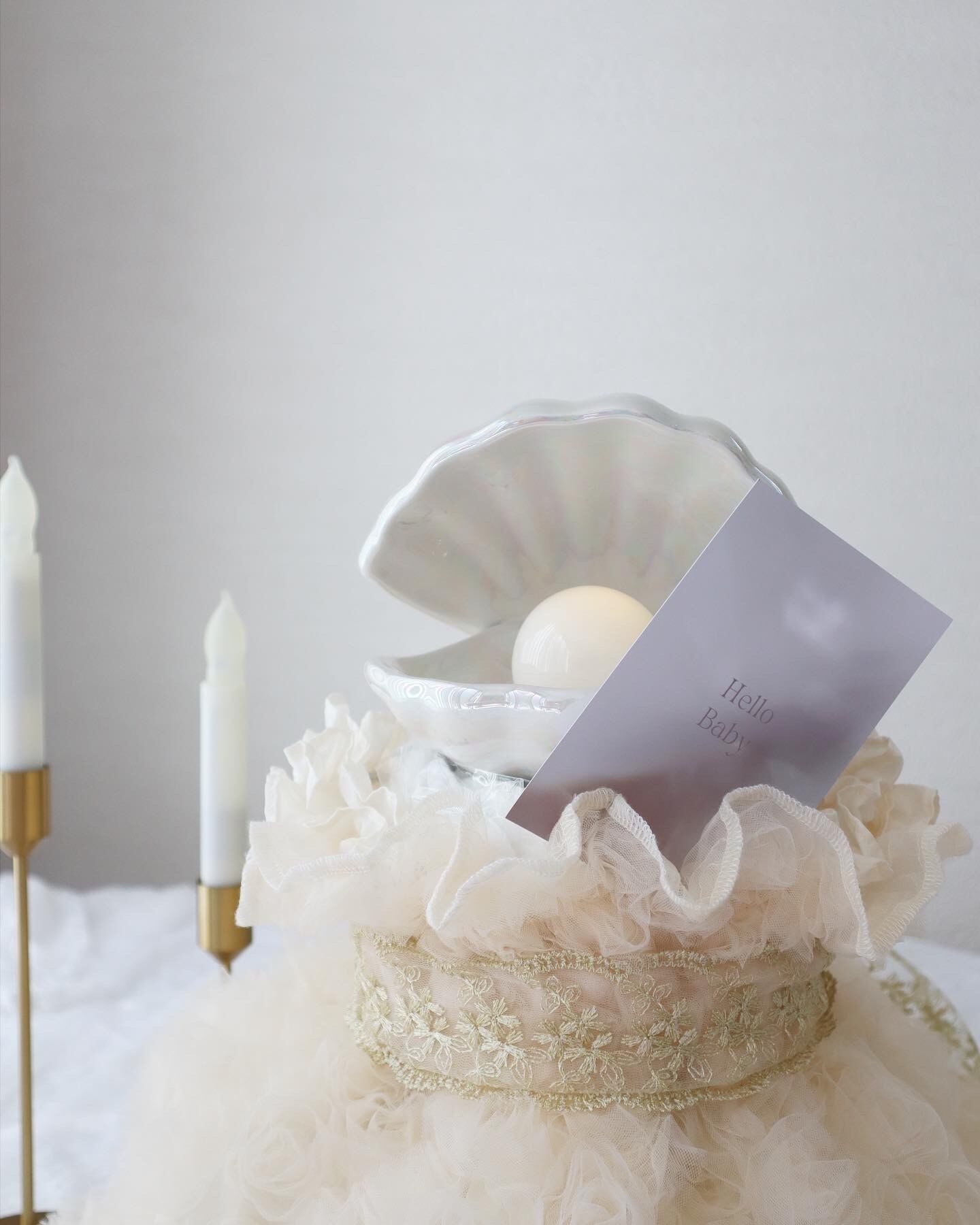 出産のお守りとして、また育児での不安を抱える方にも優しさをもたしてくれると伝承されている天然石【マザーオブパール】(真珠を生み出す貝殻のことです)をモチーフにしたベビーシャワー用ダイパーケーキです❤︎
